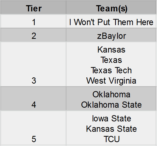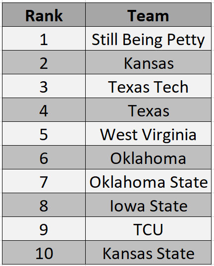 I bet I get at least six of those wrong. This order is contingent upon Mac McClung getting his waiver approved and he shows out; if he doesn’t live up to expectations, you can put Texas, Texas Tech, & West Virginia in a bag, shake them up, and place them in any order and I probably wouldn’t argue much. I might give the slightest nod to Texas & West Virginia over a McClung-less Tech squad, but there’s still not a ton of daylight between these teams.